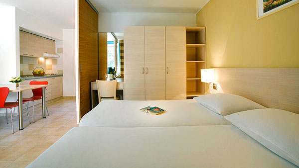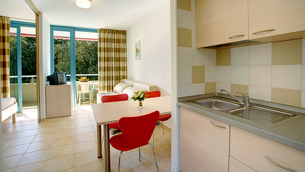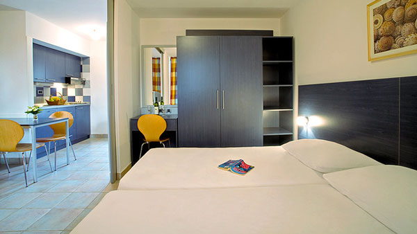 På Solaris Naturist Resort forefindes både ferielejligheder uden pension samt hotelværelse med halvpension.